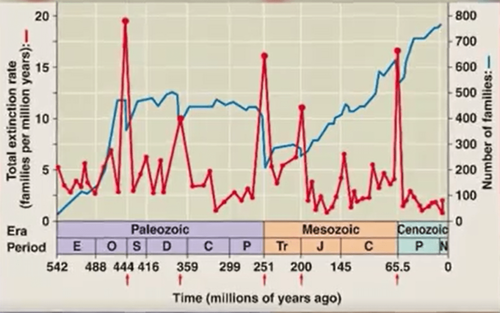 This graph shows the apparent percentage not the absolute number of marine animal general becoming extinct during any given time interval. You will see this in the red line. The blue line is the increasing number of species along time. The red line does notre present all marine species just those that are readily fossilized