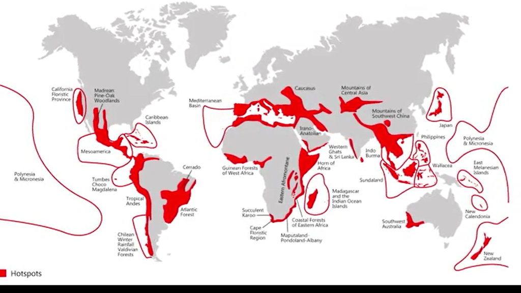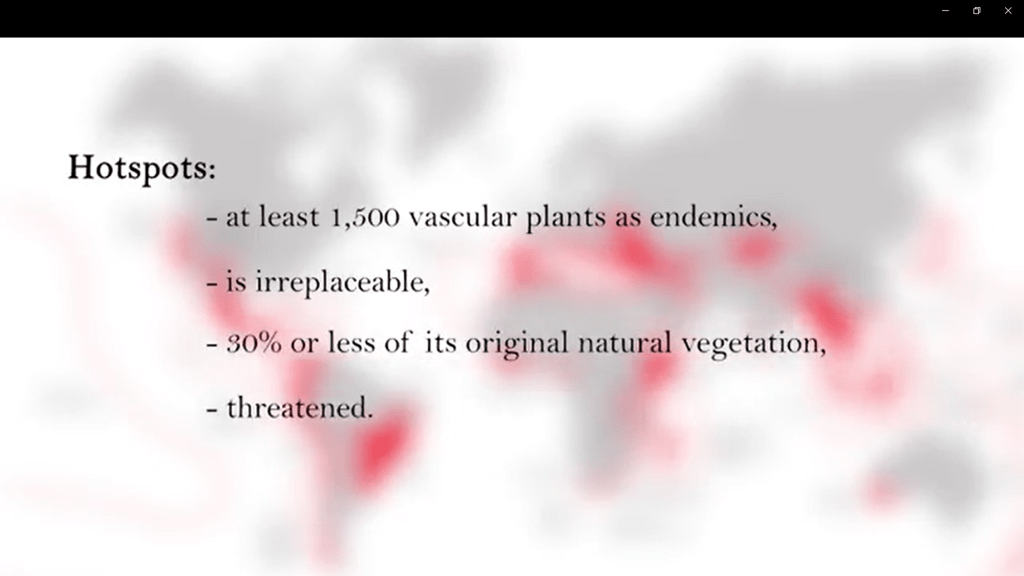 During the last lecture I told you about hots pots. This time I want to explain you in more detail what that means. Certain areas have a large number of endemic species, those found nowhere else. Many of these are early treated by habitat loss or other human activities. These areas are the biodiversity hotspot. 35 regions while success in conserving species can have an enormous impact insecuring our global biodiversity.