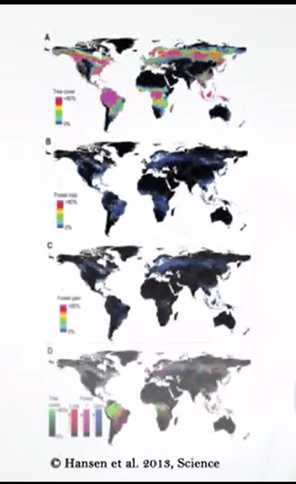 In this figure, there isa representation of tree cover, A. Forest lost, part B, and forest gained, part C. This is a color composite of tree cover in green, forest lost in red, forest gained in blue, and forest lost and gained in magenta, as shown in figure D. With loss and gain enhanced for improved visualization.