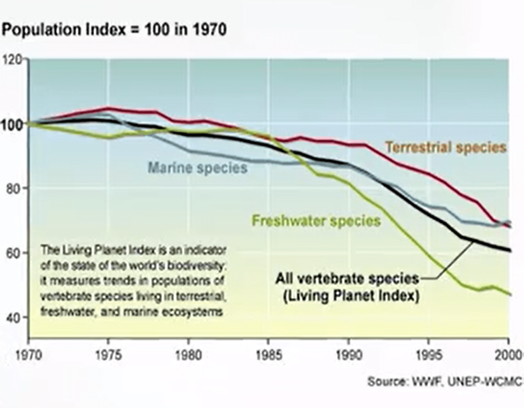 The living planet index isa good way to understand the trends of population of modern era. It is a measure of the state ofthe world’s biological diversity based on the population trends ofvertebrate species from terrestrial, fresh water, and marina animals. The living plant indexis trends of thousands of population time series collected from moderate sides around the world.