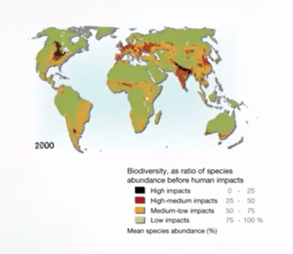 You can see that biodiversity can beconsidered as a ratio of species abundance before human impact. Despite this crucial rule for providing ecosystem services, agriculture and particularly pasture remains the largest driver of genetic erosion, species lost and conversion of natura