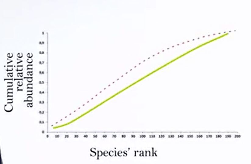 There are different ways torepresent biodiversity on a graph. One other way to represent biodiversityin a graph is the k dominance curve. K-dominance curve is a powerful tool for measuring abundance trendsin communities over time. K-dominance curve are the cumulative rankin abundance against the log species rank. In the graph on the X axis you putthe species rank, and on the epsilon axis you put the cumulative relative abundanceand you obtain the K-dominance curve.