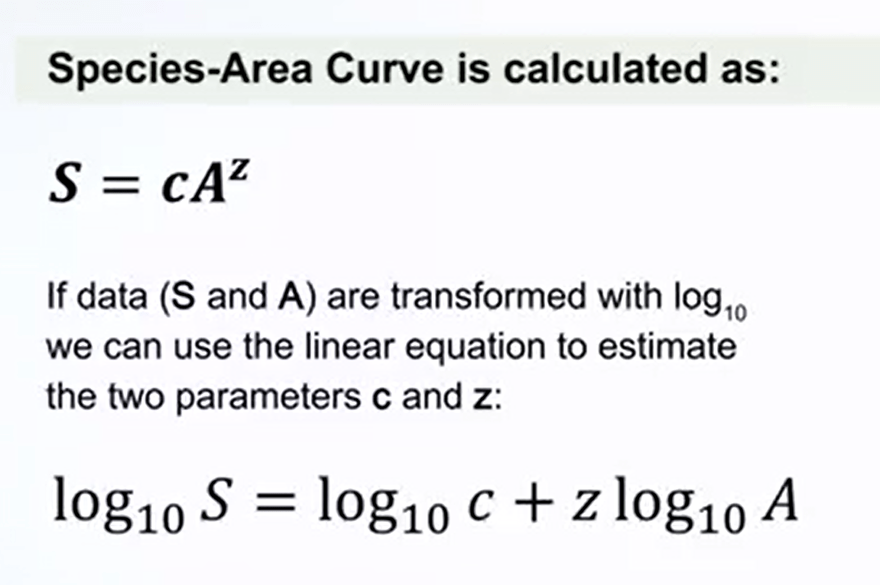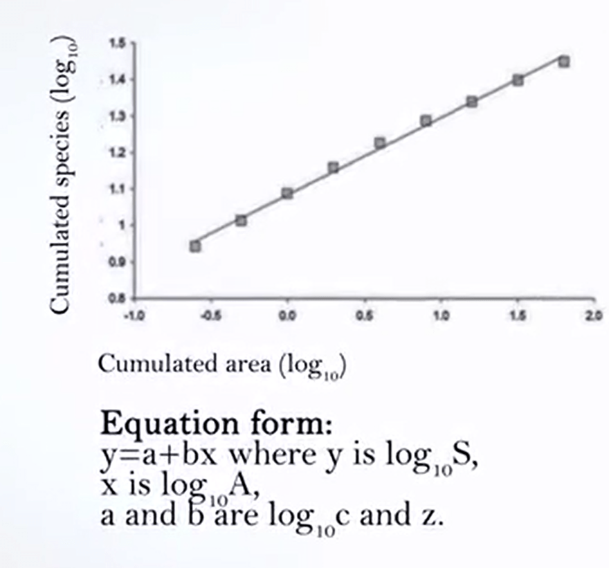 A very powerful tool to understand biodiversity is the species observed. This is a relationship between the area of or part of a habitat, and the number of species found within that area. Larger area tend to contain larger number of species. And empirically, the relative number seem to follow systematic mathematical relationships.