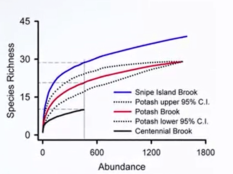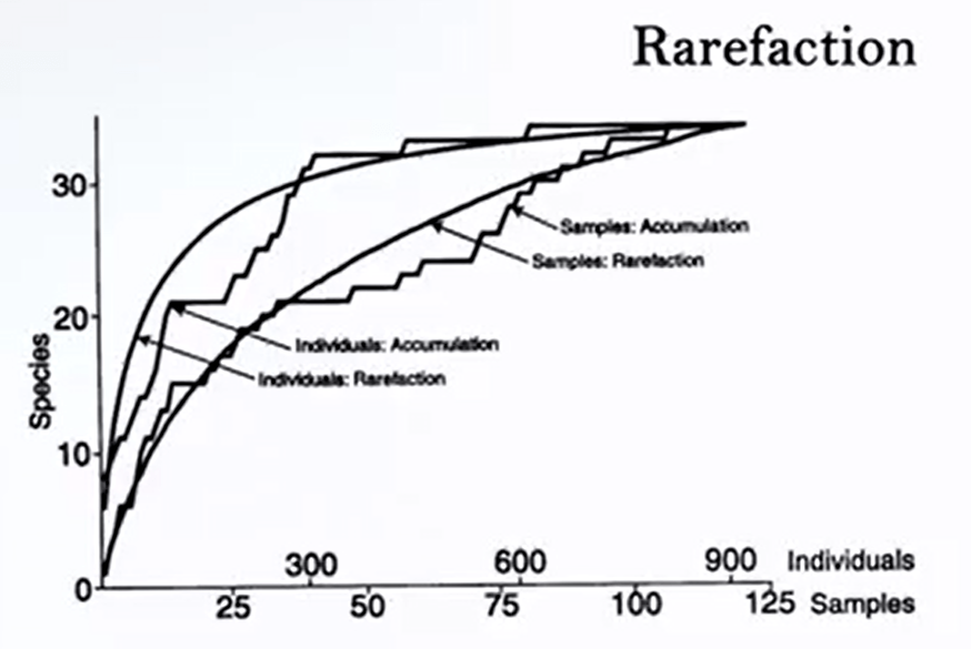 All right, I read from right side to left side and this means that we can reduce the number of samples to estimate the number of species we have down. Rarefaction is used for basic abundance data estimate the number of species in 1,2,etc., samples. Until we reach t samples on the assumption that all individuals in all samples are randomly mixed. That rarefaction generates the expected number of species. It has more collection of n individuals or n samples drawn at random from the large pool of n samples. So thanks for your attention. See you in the next lecture.