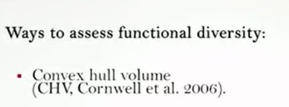 So, what are these different ways to assess functional diversity? One of these is the convex hull volume. This index estimates the volume occupied by traits of a coexisting species. The species that fall in the volume does not increase it, and therefore this index is influenced by the species are placed in this margin. That have very dissimilar traits. And those which form the vertices of the parameter in the case of only two species or volume more than two species.