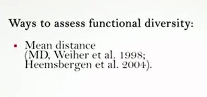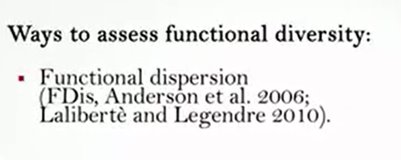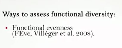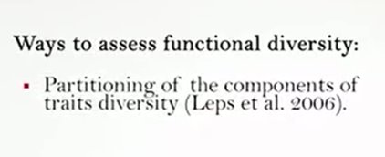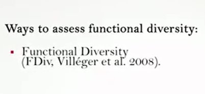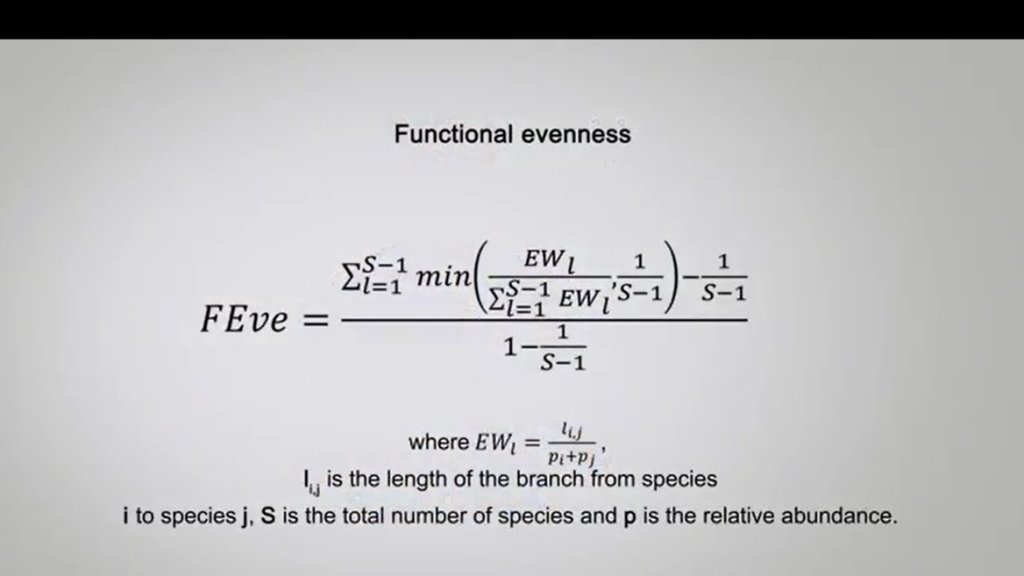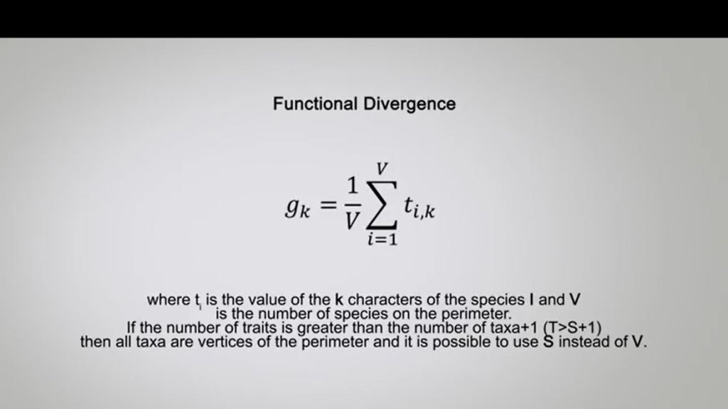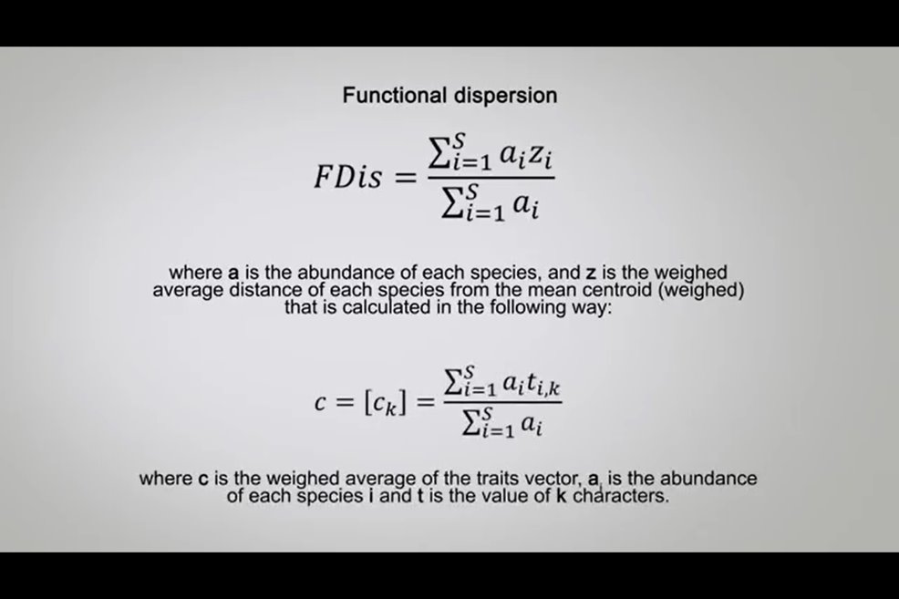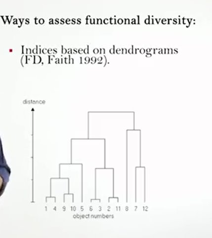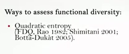 One of the most complex aspects in the function of diversity measurements is the identification of taxa traits. One approach is to analyze the measured challenges or limitation to the species’ performances, and then identify the ideal characters or traits simply and phenotypically measurable. For plants for example, the main challenges include dispersion, the rooting ability, and the persistence. And it is therefore possible to identify as the main trace the mass of seeds, the type of leaves and the height. However, when the inconsistent function are considered, it is fundamental to individuate a subset of species traits. An alternative method is to identify the characteristics associated with the life history or the acquisition of resources, for instance motility, anatomical structure for foraging, and resource utilization methods. So as the generality among all the we can differently say that fdq or the quadratic entropy is the most simple, quick and use it in addition to the advantage of incorporating the abundance data and to be similar to data Simpson. However, it is better to don’t consider a single indicator as a true representative of the functional diversity of the community, but to calculate at least three of them to get the more complete picture. So guys, thanks foryour attention and see you next time.