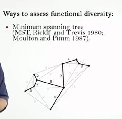 An entity way to understand the differences in functional diversity is the minimum spanning tree. That is the length of the minimum not recursive tree that connects all species in the trait space. In other words, is the shorter continue segment of connection between points without passing two times from the same point. It is a simple and very similar meter to venograms, but it has the advantage of not requiring the grouping of points and their calculation of the distances.