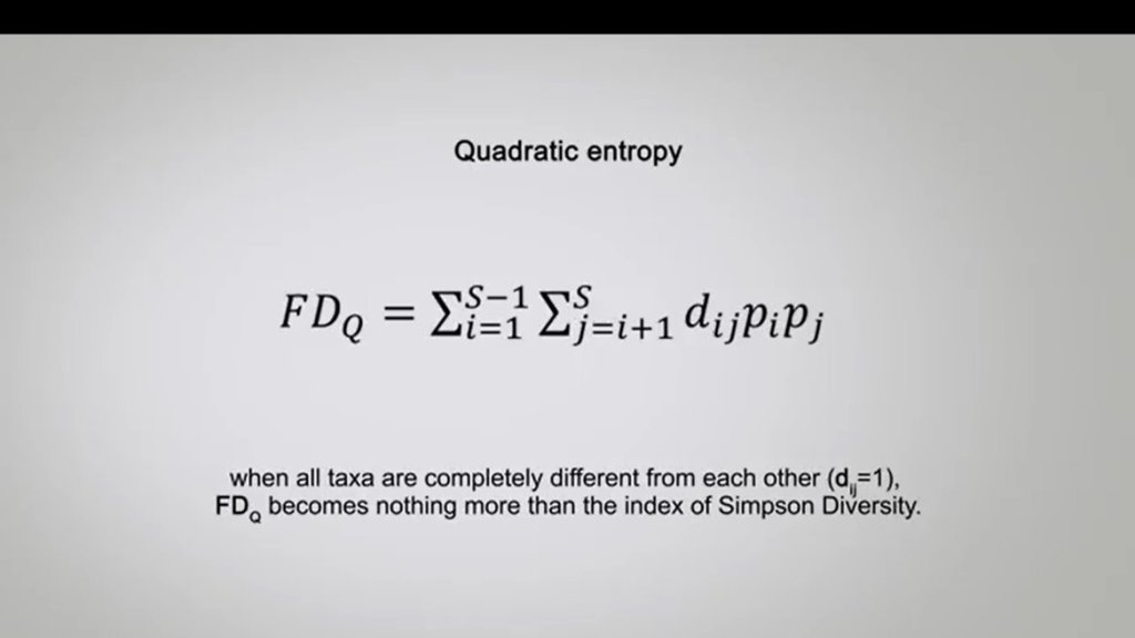 You will see the formula in the picture when all taxa are completely different from each other dij is equal to 1 and fdq, so the quadratic entropy becomes nothing more than the index of Simpson Diversity. So, it can be easily converted into this index.