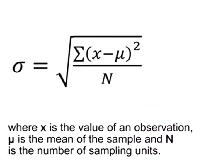 the standard deviation, is a measure of variation around the mean of the sample, and it can be calculated in the following way. In this formula, you see that xis the value of an observation, mu is the mean of the sample, and N is the numbers of sampling units. The numerator of the radical is defined of deviance. When the data are grouped by frequency values, it is needed to multiply the frequency f to the numerator of the radical. The variance, however, is simply the square value of the standard deviation, as indicated by a sigma square or s square.
