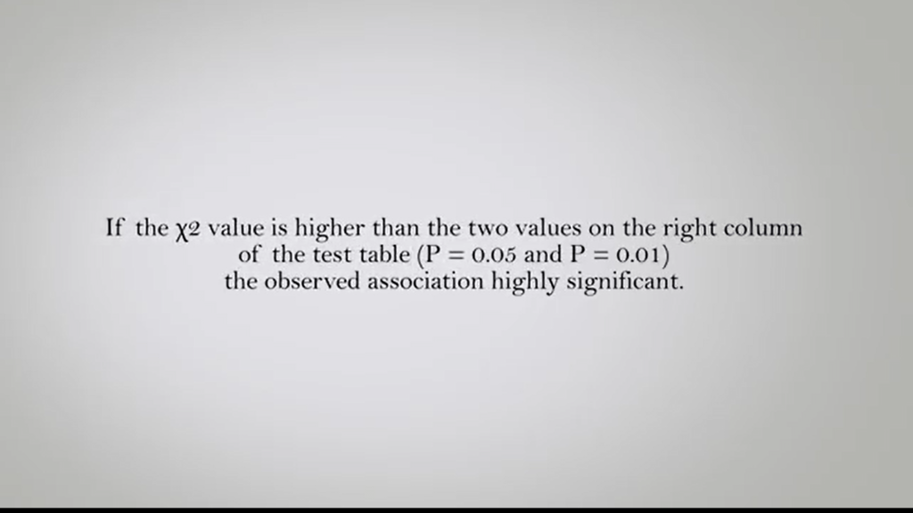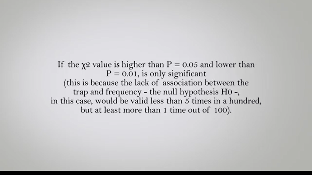 If the chi square value, we obtain is higher then the two values on the right column of the test table. Which contains the three short values for the probability 0.05 or 0.01. It can be concluded that the observed association between the frequencies and the related samples is highly significant. In the example, the trap with the higher number of spiders captured is significantly more effective in capturing these animals, if compared to the other two tested.
