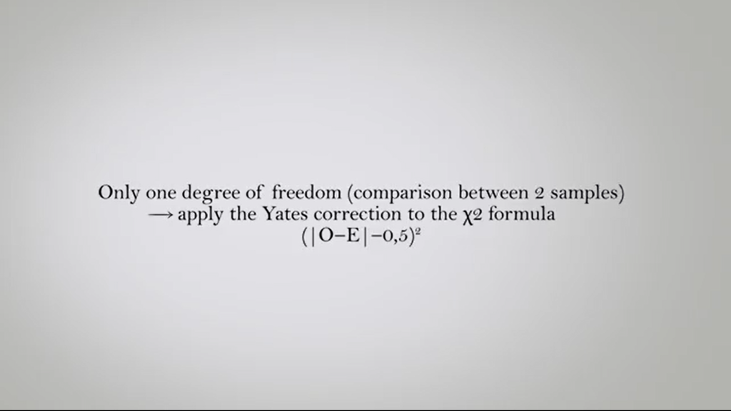 When there is only one degree of freedom, comparison between two samples, for instance, it is necessary toapply to the chi-squared formula the Yates correction for continuity, which simply consists in subtracting 0.5 to the numerator of the formula.