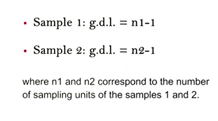 After calculating the variancesof the two samples, as described in the previous lectures, derive the degrees of freedom. So for the sample one is just degree of freedom minus one, and sample two the same, where n1 and n2 correspond to the number of sampling units of the samples 1 and 2.