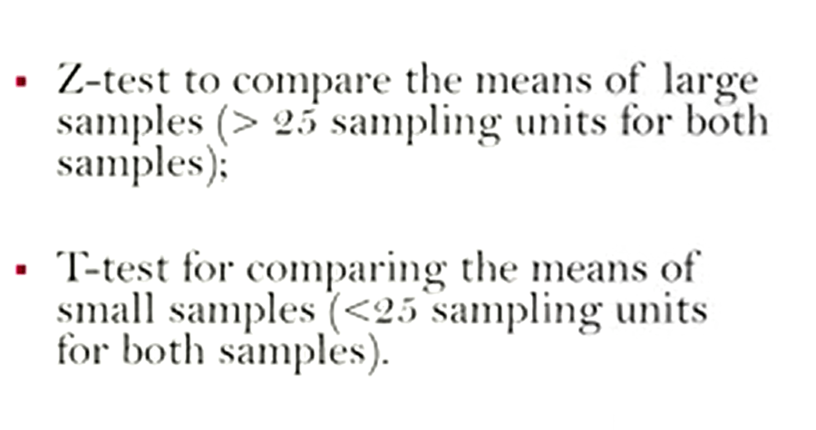 We can conduct the Z-test to compare the means of large samples. It means more than 25 sampling units for both samples, or we can carry the T-test for comparing the means of small samples. It means less than 25 sampling units for both samples.