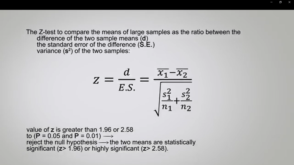 If the calculated value of that is greater than 1.96 or 2.58, which is the normal distribution corresponding to P 0.05 or P 0.01, you can reject the null hypothesis and confirm that the two means are statistically significant or highly significant respectively.