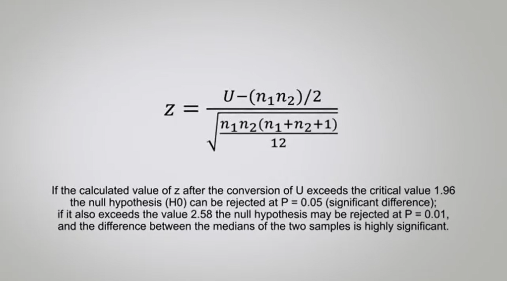 To do this, we add up the following formula. If the calculated value of zed after the conversion of U exceed the critical value of 1.96, the null hypothesis H0 Can be rejected at P=0.05 that there is a significant difference. If it also exceed the value at 2.58 the null hypothesis may be rejected at P=0.01, and the difference between the medians of the two samples is highly significant.