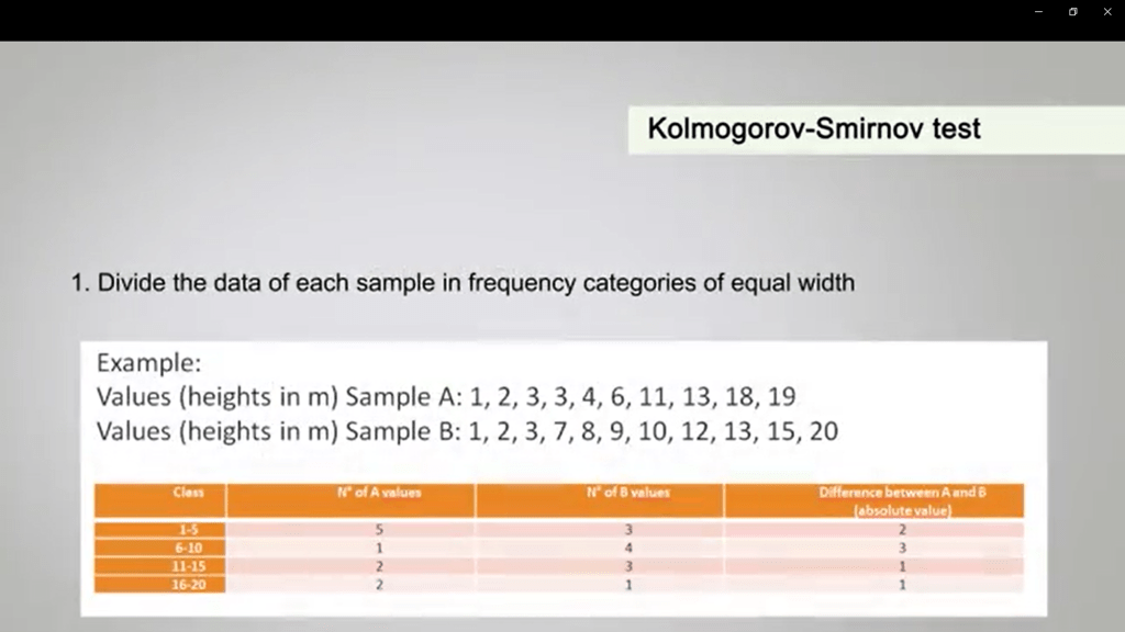 Another useful non-parametric test when you want to compare two samples is the Kolmogorov-Smirnov test. The Kolmogorov-Smirnov test allows you the comparison of quantitative data, and to calculate it you need to proceed as follows. First of all, you divide the data of each sample infrequency categories of equal width. In the example that Is how you in this table, you can divide the heights in five meter, in five. So, it means that one category is 1,5, the second one is 6, 10, the third one is 11, 15 and the fourth one is 16, 20.