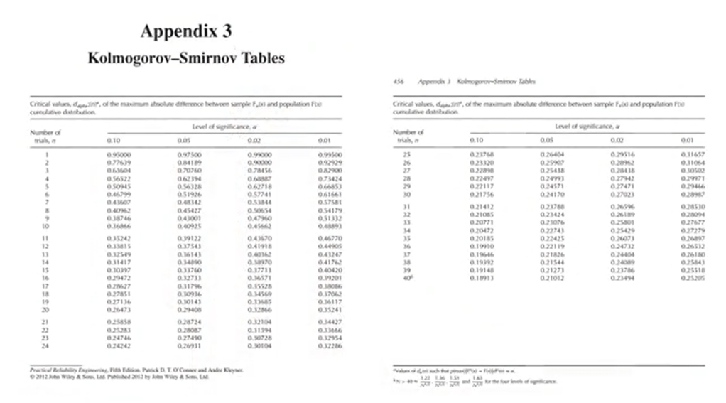 Please note that there are two tables for the Kolmogorov-Smirnov test. One for samples with n less than 40.