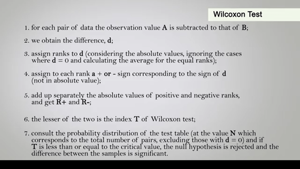 The last non-parametric test I’ll show you today is the Wilcoxon Test. We can use this test when data are paired. In reality, the two samples certainly belong to the same population, but show different characteristics in the observed values. For example, the diameter of the same tree measured what one year of distance or the weight of the same bird, mark it and recapture it after migration. So, to calculate this index, you need to proceed as follow. First, for each pair of data, the observation value A is subtracted to that of B. Then in this case we obtained a difference that is called d. We assigned ranks to d considering the absolute values ignoring the case where d is equal to zero and calculating the average for equal ranks. So, we assign to each rank a plus or minus sign corresponding to the sign of d. Of course, not in absolute value. Then we add up separately the absolute value so positive and negative ranks. And we get our plus and our minus. So, the lesser of the two values is the index T of the Wilcoxon test. So, then we consult the probability distribution of the test table at the value N, which corresponds to the total number of pairs, excluding those with d is equal to 0. And then, if our T value is less than or equal to the critical value, the null hypothesis is rejected, and the difference between the samples is significant. This test can be used only if the total number of pairs excluding those with d is equal to zero, is greater than or equal to six.