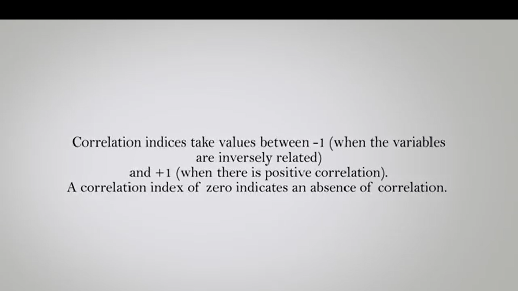 Why it is an indirect or negative when changing a factor, the other varies in the opposite direction. The degree of correlation between the two variables is expressed by means of correlation indices. These take values between -1,when the variables are inversely related. And +1,when there is a positive correlation. That is when the change of a variable corresponds to a rigidly dependent variation of the other. A correlation index of zero indicates an absence of correlation. Two independent variables havea correlation index equal to zero. But this doesn’t not necessarily imply that the two variables are independent.