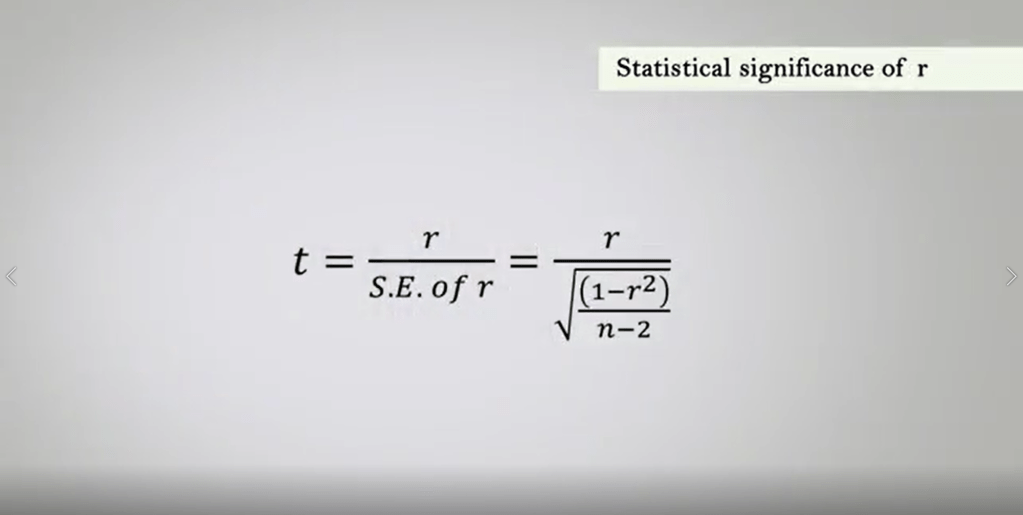 The statistical significance of r can be calculated in the parametric test directly from the tables of the probability of the distribution. Simply dividing r for S.E. So that’s the Standard Error of r. So, you can see that t, in this case, is just r, so the coefficient of correlation divided by the Standard Error of r. The values of t may be compared with those in the table of the critical t statistics. The correspondence of N total minus one, minus one degrees of freedom sowe have N epps and N epsilon.