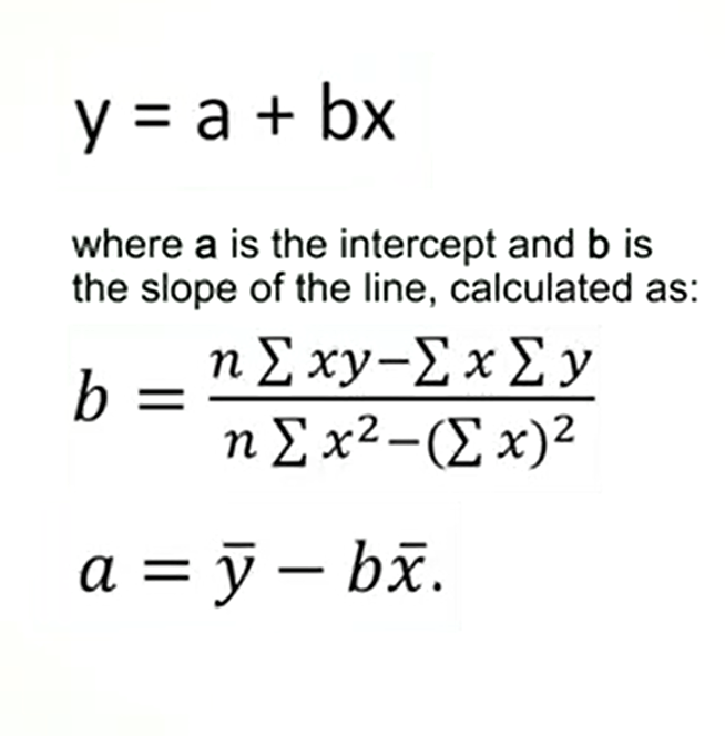 This line is called regression line. And the equation is epsilon equal to a plus b multiplied by x. Where a is the intercept and b is the slope of the line calculated as in this formula. And a is calculated as the mean upsilon minus b mean x.