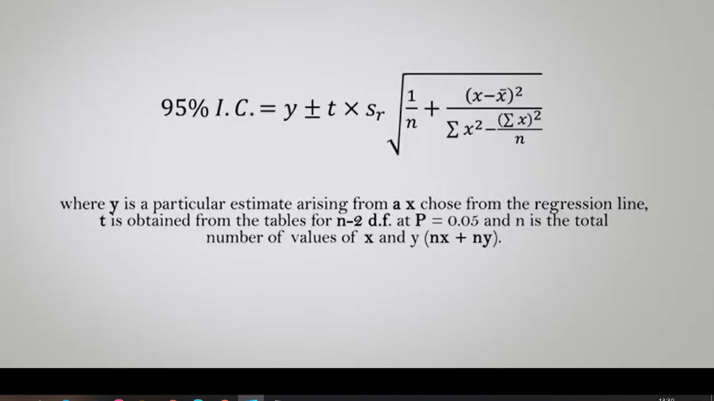 Then, we can estimate the 95% confidence interval. So, 95% of confidence interval, you just calculate by this equation. We use upsilon plus or minus t multiplied by the interval of confidence that we calculate from the residual variance last time. Where in this case, the formula is an upsilon that is a particular estimate arising from x. Choose from this regression line, and t is obtained from the tables forn minus 2 degree of freedom. At P is 0.05 and n sois the total number of values of x and upsilon, so n and x plus n upsilon. Repeating the calculation for many values of upsilon arising from x, it is possible to trace the confidence along the regression line.