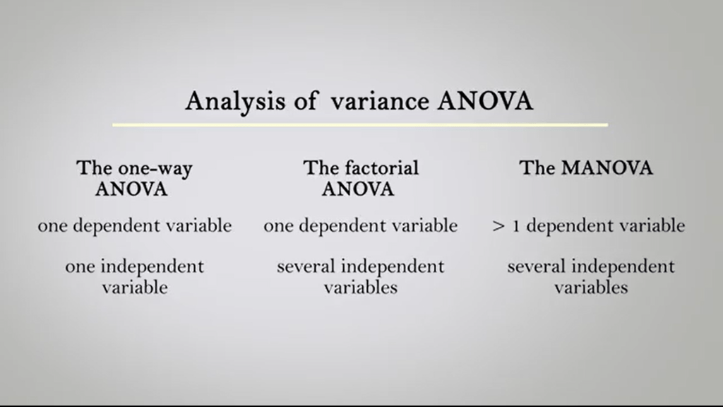 The one-way ANOVA is used is when thereis only one dependent variable, and one independent variable. The factorial ANOVA instead is used for when we have only one dependent variable, and several independent variables. The MANOVA, so the multivariate analysis of variance, is used when we have more than one dependent variables, and several independent variables. The ANOVA technique need can be extended to the analysis of written number factors. The analyzed variable is always one in the ANOVA, but the number of factors or classification criteria or paths that distinguish the different samples is greater than one. This is called a univariate multifactorial ANOVA. There are many statistical software that carry out the calculation of the various type of ANOVA in a few minutes by simply setting the data as required. If we want to compare means of an ecological variable detected in different samples, more than two, the analysis of variance with one criterion or classification, one dependent variable and one independent is the best choice. When instead we want to compare means of a ecological variable detected in different samples, always more than two, but after some time. The best technique is to analyze the variance with two classification criteria. This is an ANOVA which estimates the effect of two independent variables on a dependent variable. Sex and season or weight, for instance. Eye and temperature and diameter, and so soon.